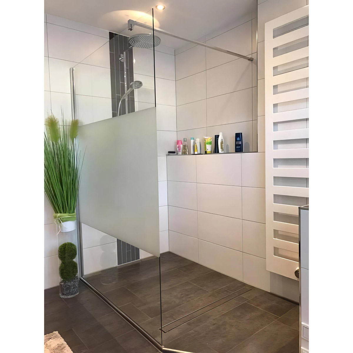 Ця скляна перегородка для душу виготовляється з безпечного загартованого скла товщиною 8–10 мм частично матова щоб створити ефект «інтимної зони». Особливо актуальна для сімейних ванних кімнат, готельних номерів, спортзалів чи спа-комплексів.